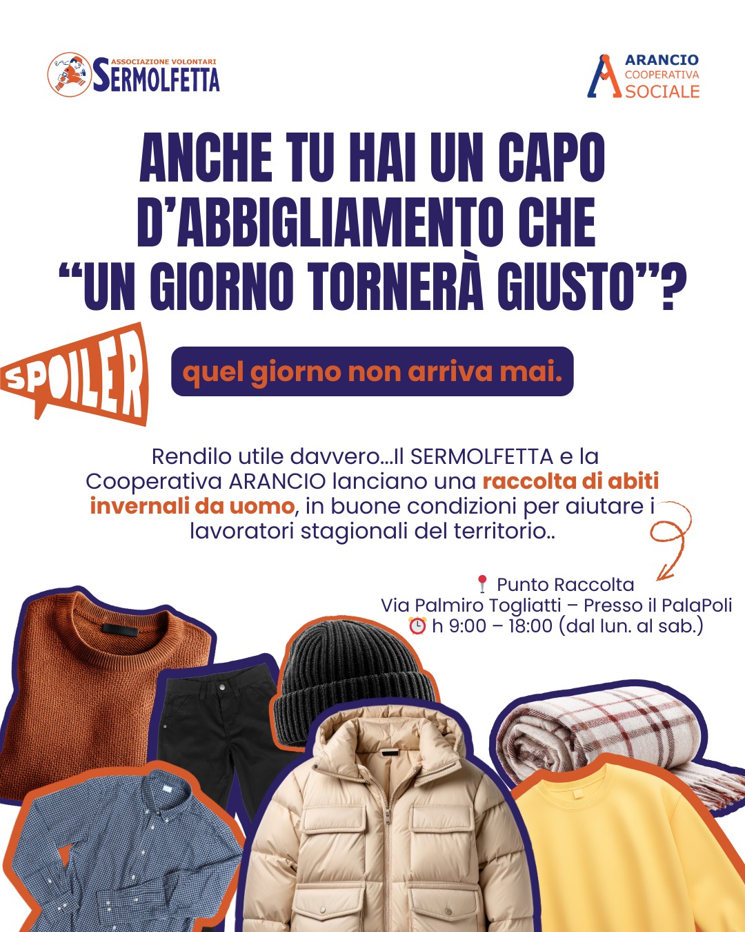 Anche tu hai quel capo d’abbigliamento che “un giorno tornerà giusto”?📢 Spoiler: quel giorno non arriva… ma puoi trasformarlo in qualcosa di davvero utile. Il SERMOLFETTA e la Cooperativa ARANCIO raccolgono abiti invernali da uomo (in buone condizioni) […]